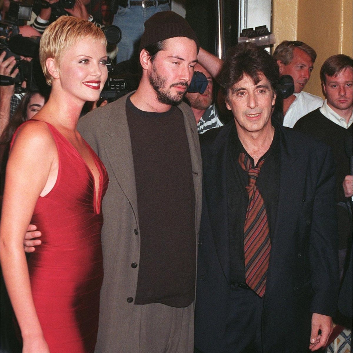 – Al Pacino, Keanu Reeves and Charlize Theron at the premiere of the film The Devil’s Advocate –